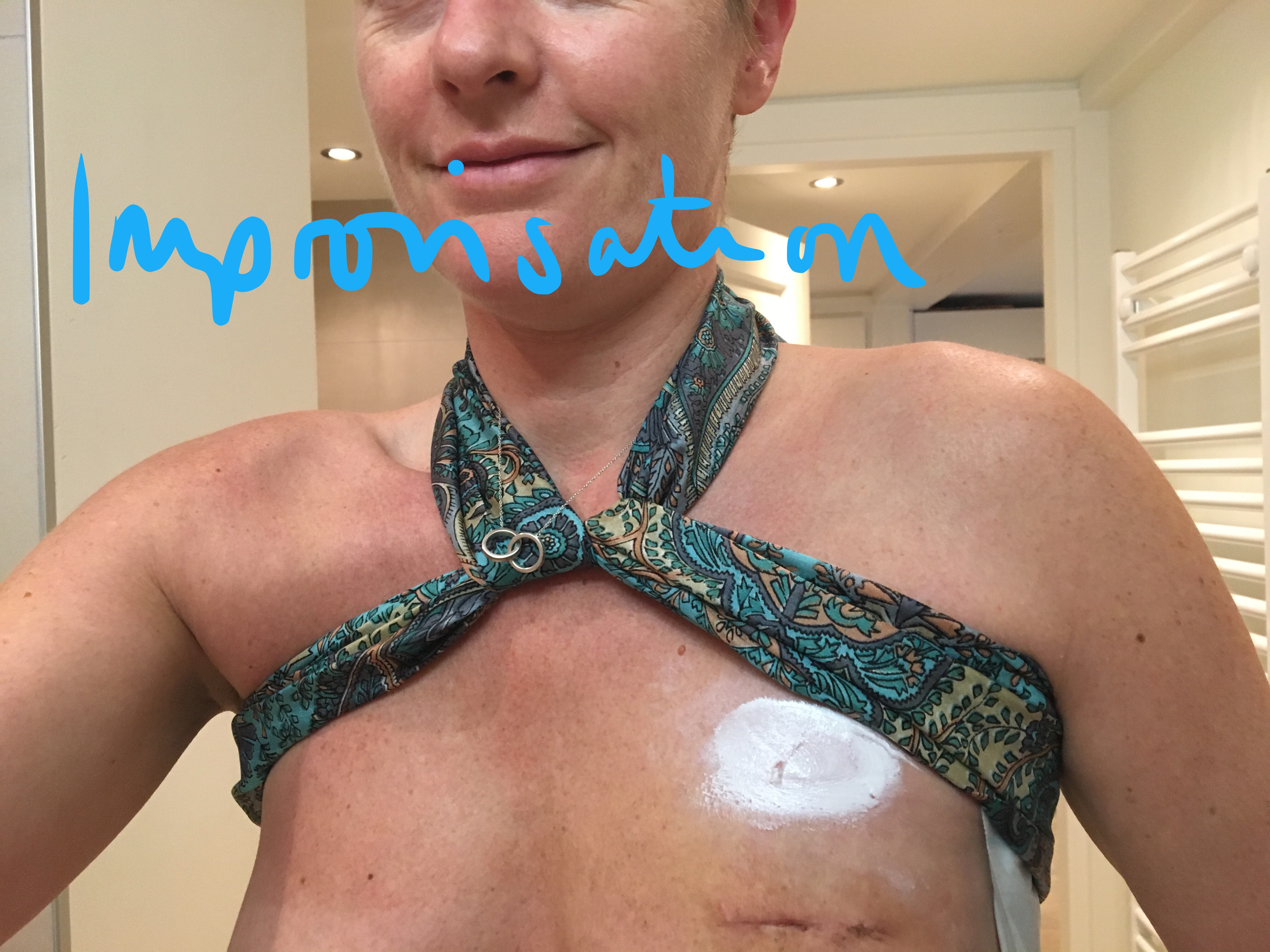 So since then, I’ve been improvising! How do you hold on a 10cm-wide absorbent pad under your armpit without using tape or plasters, while avoiding the areas where you’d typically attach tape (as these are now blistered and covered in thick, gloopy nappy rash cream) and without aggravating the wound on the boob?! I’ve tried bandages over my opposite shoulder, scarves around my chest, bikini tops, and even cut the arms and waist off my hockey base layer (as it’s tight enough to hold things in place, but too hot to wear in it’s full form). All creative ideas welcome! By this point, I’m trying all sorts!