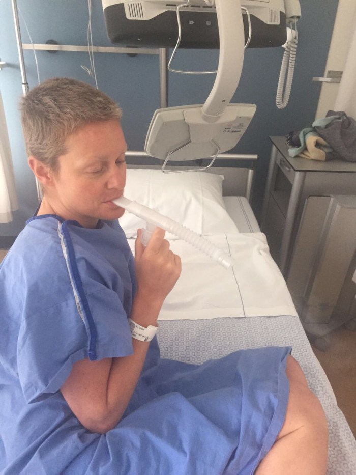 I change into my delightful blue gown and ‘normal stretch’ pants – hot! – and the ward nurse appears with a pipe. Right. What? I know I’m having treatment in the Netherlands, but a pipe? And it’s smoking? Yes, they actually want me to smoke this thing! We have a few giggles about how to say “puff” in English and there I am, sitting in a hospital ward, wearing a blue gown, puffing away on a bong?! (Apparently, the pipe is a nebulizer to clean my lungs, but I preferred to think of it as a bong.)