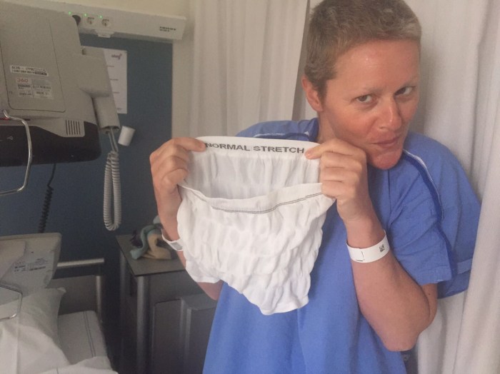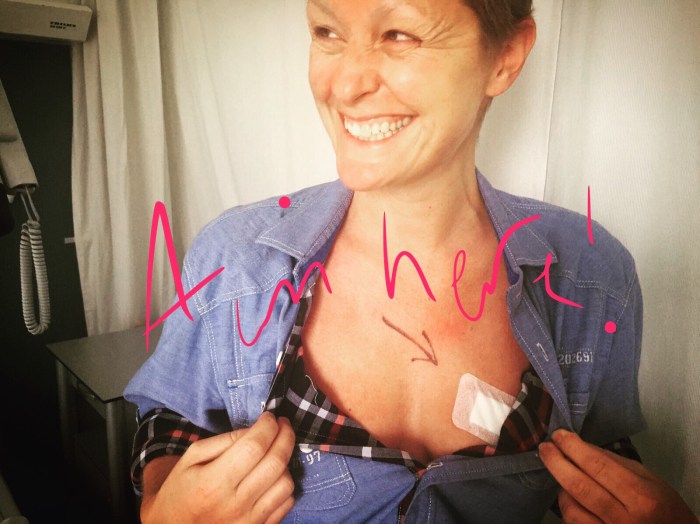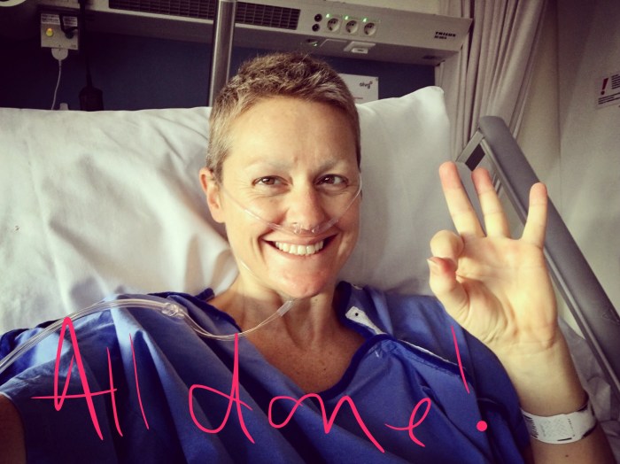 I went in on Wednesday at 9am, and the first thing to happen was a scan. The downside of doing things in another language, is that sometimes things get a little ‘lost in translation’. So there I am explaining to Kari what happens in an MRI, when a nurse comes and shuffles me into the Ultrasound room… erm ok, I don’t mind that – it’s far less invasive and there’s no cannulas – yay! As the image comes up on screen, Nursey is happy that she can see the tumour, and is ready to inject it with dye (so the surgeon can clearly see it when she opens me up). Now I’m not sure how I thought they’d inject the dye other than by using a needle. But when she pulled out this three-inch long needle, I suddenly realized where that thing was going! I may have survived five months of chemotherapy, but my pain threshold is useless – I squeal when plucking my eyebrows! So when I ask if I’ll have any anaesthetic for that thing, and she replies “no”, things start to get real! But nursey explains that the needle is super thin, and I’ll only feel a little prick as it touches my skin. Luckily she was right. There was a funny kind of numbness inside my boob when the dye went in, but all I really felt was a tiny prick, that’s all – happy days!